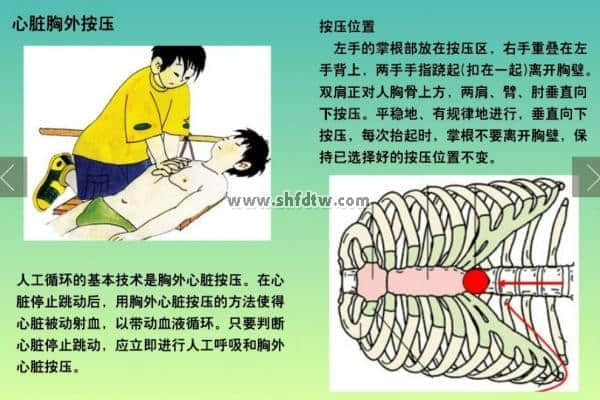 按壓部位不宜過低,以免損傷肝、胃等內(nèi)臟。壓力要適宜,過輕不足于推動(dòng)血液循環(huán);過重會(huì)使胸骨骨折,帶來氣胸血胸。